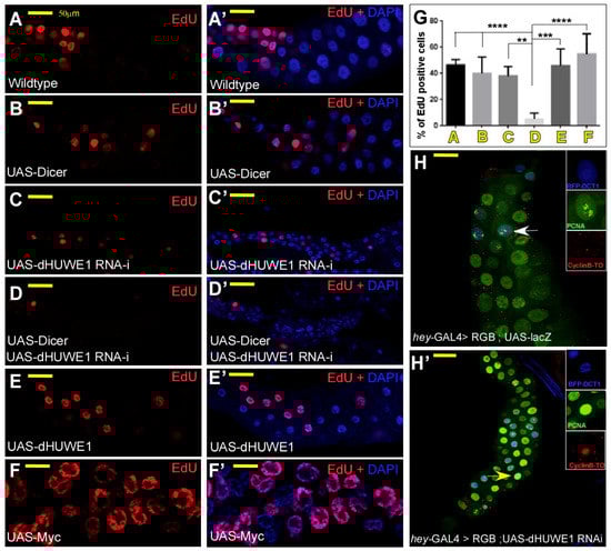 Reduced ploidy can originate from two different scenarios [30,43]: (1) A defective mitotic-to-endocycle switch or (2) impaired endoreplication. The first scenario results in extremely small shoe-string-like salivary glands that are devoid of EdU/BrdU staining [44]. Although ploidy levels were severely reduced, the dHUWE1-depleted salivary glands likely underwent a limited number of endoreplication cycles. To test this notion directly, we assessed DNA synthesis in dHUWE1-depeleted salivary glands by monitoring EdU incorporation. In contrast to wildtype or UAS-Dicer expressing cells, reducing dHUWE1 levels resulted in a significant reduction in EdU-positive cells (Figure 3A–D’, and quantified in 3G), indicating that it is dHUWE1 loss that impairs the endoreplication machinery rather than a failure in the mitotic-to-endocycle switch. Consistent with previous studies that indicated that increased dMyc expression promotes endoreplication in Drosophila salivary glands [35], we found increased ploidy levels and EdU-positive cells upon ectopic expression of dMyc. Overexpression of dHUWE1 resulted, however, in an EdU pattern that was highly similar to wild-type control (Figure 3E–F’, and quantified in 3G), implying that ectopic dHUWE1 cannot accelerate the rate of endoreplication in a manner similar to dMyc.