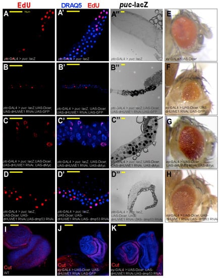 Eliminating dmP53 or expression of dMyc suppresses phenotypes associated with loss of dHUWE1. (A–D’) Indirect immunofluorescence confocal microscopy images of salivary glands derived from wild-type and the indicated transgenic lines under the control of Ptc-Gal4 labeled with EdU to indicate active DNA synthesis. DAPI (blue) marks DNA and the scale bar is 50 μm. (A”–D”) Expression of the JNK pathway reporter puc69:: LacZ (black) in salivary glands derived from control and indicated transgenic lines under the control of Ptc-Gal4. (E–H) Adult eye morphology in wild-type (E), and the indicated UAS-transgenic lines (E–H), under the control of the eye-specific Gal4, eyeless-Gal4 (ey-Gal4). (I–K) Confocal images of eye imaginal discs of wildtype (I) or the indicated transgenic lines (J,K) under the control of ey-Gal4 immuno stained with anti-Cut antibody (red) and DAPI that marks DNA.