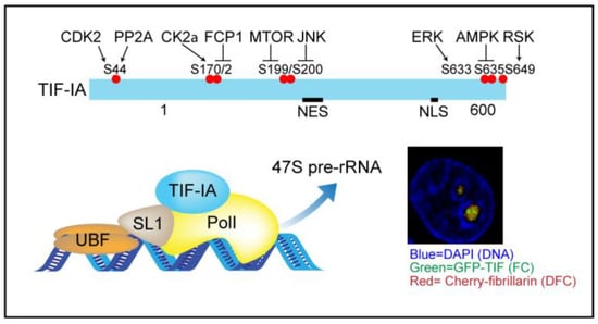 TIF-IA is the key component of the PIC that transduces environmental signals to the PolI transcriptional machinery [22,45]. If nutrient availability is altered or the cell is under stress, the phosphorylation status of TIF-IA is modulated by a complex network of kinases and phosphatases, which ultimately activate or inactivate the protein to fine tune the transcriptional output (Figure 1) [46]. While TIF-IA is mainly known for its role in the nucleolus, the protein shuttles dynamically between this and other cellular compartments. Indeed, using a GFP-TIF-IA approach, Szymański et al. found that 48% of the protein is present in the cytoplasm while only 7% is located in the nucleolus (although the concentration in the nucleolus is higher) [47]. The mechanisms that control the cellular localization of TIF-IA are still unclear, but are known to be targeted by specific stresses [48]. It is also unclear if the protein plays a role in other compartments. What is clear is that it is an important regulator of cell proliferation and apoptosis. Genetic deletion in mice leads to embryonic lethality while deletion or depletion in mouse embryonic fibroblasts (MEFs), cancer, and neuronal cells causes cell cycle arrest and apoptosis [49,50].