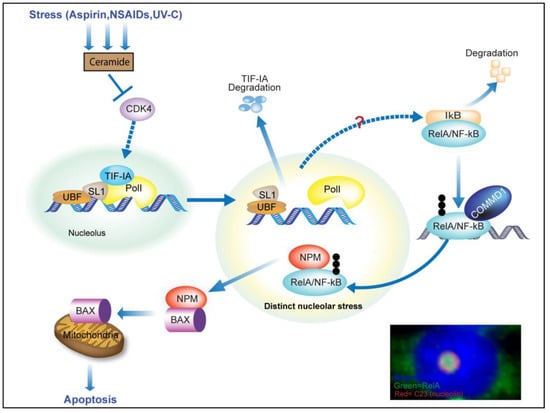 It was originally assumed that nucleolar translocation of RelA mediates apoptosis because the protein is sequestered away from the promoters of anti-apoptotic genes. However, it is now known that once in the nucleolus, RelA triggers a cascade of events that actively promotes apoptosis (Figure 3) [6]. That is, nucleolar RelA causes nucleophosmin (NPM)/B23 to relocate to the cytoplasm, bind BAX then transport BAX to the mitochondria to initiate apoptosis [6,80,81]. Others have also demonstrated that NPM relocalization, and an NPM-BAX interaction, is critical for the pro-apoptotc effects of NF-κB stimuli such as UV-C, [81]. Interestingly, stress stimuli such as aspirin and UV-C that utilize this pathway to induce cell death, also cause degradation of TIF-IA and atypical nucleolar stress, suggesting that these initial effects on nucleoli may prime cells for subsequent nucleolar accumulation of RelA and cytoplasmic translocation of NPM (Figure 3).