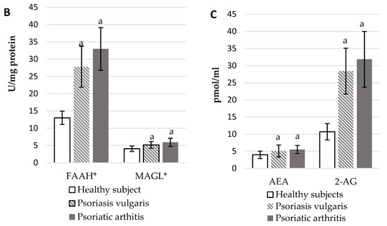 Endocannabinoid system receptor expression in granulocytes* of healthy subjects (n = 8) and patients with psoriasis vulgaris (n = 16) and psoriatic arthritis (n = 8) (A), endocannabinoid levels, (C) and activity of enzymes metabolizing endocannabinoids in plasma (B) of healthy subjects (n = 34) and patients with psoriasis vulgaris (n = 68) and psoriatic arthritis (n = 34). a p < 0.05 when compared with healthy subjects and x p < 0.05 when compared with patients with psoriasis.
