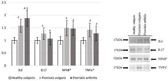 The levels of interleukins and pro-inflammatory mediators in plasma or granulocytes* from healthy subjects (n = 8) and patients with psoriasis vulgaris (n = 16) and psoriatic arthritis (n = 8). a p < 0.05 when compared with healthy subjects. x p < 0.05 when compared with patients with psoriasis vulgaris.