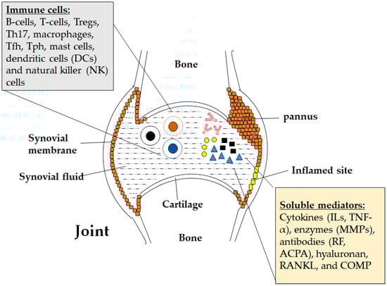 Today, medical practitioners stress the importance of early diagnosis and personalized treatment in preventing or minimizing joint destruction in treating RA []. Having this as the treatment strategy for RA and coupled with frequent assessment of disease activity, patients are reported to have improved prognosis []. This review paper discusses the role of the host’s immune system, the immune cells and the secretory immunological molecules in the pathogenesis of RA. This review also summarizes current RA treatment targeting immune cells or immunomodulatory molecules as well as the development of immunological biomarkers for RA.