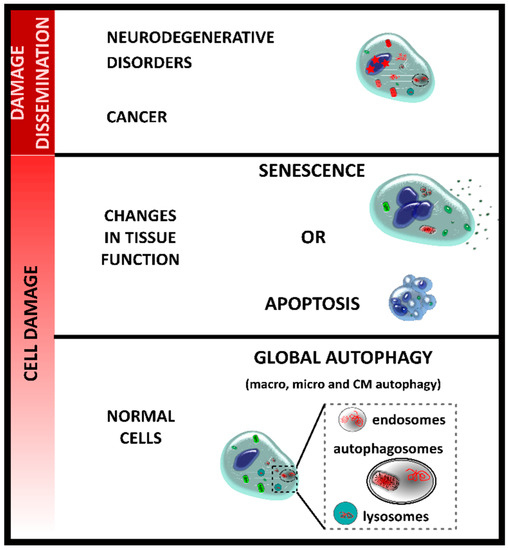 Different stages of cell damage. Autophagy is one of the mechanisms acting as the first barrier against cell damage to avoid the accumulation of non-functional organelles or proteins in the cells. When this mechanism is overburdened, apoptosis or senescence is activated. These mechanisms stop the damaged cells’ dissemination and prevent the apparition of age-related diseases, such as neurodegenerative disorders or cancer. An accumulation of damaged organelles and proteins and changes in the genetic material are observed in these diseases.