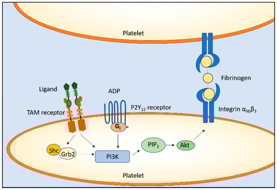 The TAM receptor/ligand complex, together with adenosine diphosphate (ADP) receptor P2Y12, leads to PI3K and Akt phosphorylation. This results in persistent activation of the fibrinogen receptor integrin αIIbβ3, leading to thrombogenesis and platelet stabilization [,,] (Figure 1).