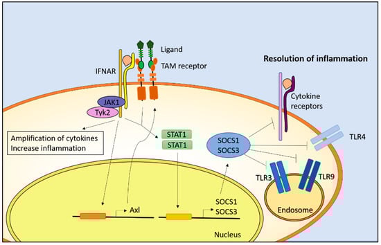 Activation of TAM receptors in dendritic cells down regulate inflammation. Activation of the type I interferon receptor (IFNAR) leads to cytokine amplification, a subsequent increase in inflammation, and the upregulation of Axl transcription. The association of the TAM/ligand complex with IFNAR leads to the transcription of SOCS1 and SOCS3. SOCS1 and SOCS3 inhibit the TLR3, TLR4, and TLR9 pathways as well as cytokine receptors to resolve inflammation. TLR: toll-like receptor; JAK: Janus kinases; STAT: signal transducer and activator of transcription protein; SOCS: suppressor of cytokine signaling.