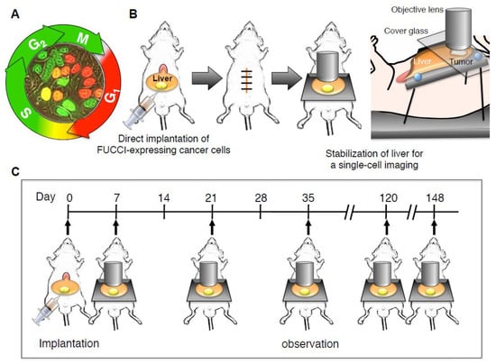 Monitoring cell cycle dynamics during tumor growth is very important for improving our understanding of cancer. Yano et al. [46] demonstrated intravital real-time monitoring of orthotopic FUCCI-expressing tumors in the liver of live mice during tumor growth (Figure 2A). Nascent tumors (7 days after inoculation) consisted of a majority of proliferating cancer cells (Figure 2B,E). Quiescent cancer cells increased during tumor growth (Figure 2C,F). In contrast, the vast majority of cells in an established tumor are quiescent (Figure 2D,G). In an established tumor, proliferating cancer cells exist only at the surface area (Figure 2C,D). Chittajallu et al. demonstrated intravital single-cell imaging of FUCCI-expressing HT1080 fibrosarcoma cells implanted in a dorsal skin-fold-chamber in nude mice. Chittajallu et al. [42] clearly visualized G1, late G1/early S, S/G2, and mitosis in vivo combining a nuclear-morphology reporter (histone H2B-CFP) and the FUCCI system. Chittajallu et al. [42] could image for only two weeks, since tumor growth was limited to the depth of the chamber.