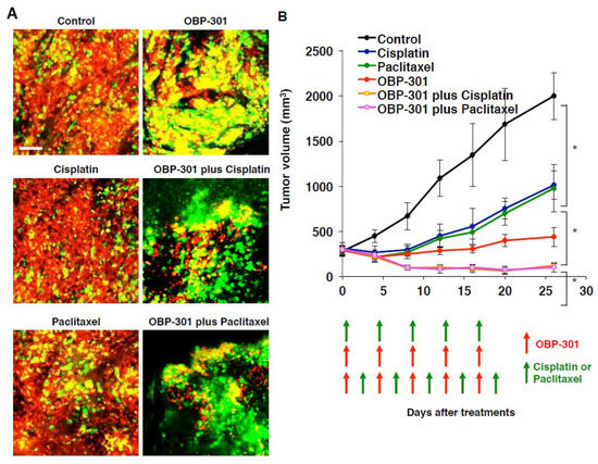Oncolytic adenovirus, OBP-301, decoys quiescent cancer stem cells to cycle and become chemosensitive. FUCCI-expressing MKN45 cells (5 × 106 cells/mouse) were injected subcutaneously into the left flank of mice. When the tumors reached approximately 8 mm in diameter (tumor volume, 300 mm3), mice were administered OBP-301 intratumorally (1 × 108 PFU/tumor) and injected intraperitoneally with cisplatinum (CDDP) (4 mg/kg) or paclitaxel (PTX) (5 mg/kg) for five cycles every 3 days. (A) Representative images of cross-sections of FUCCI-expressing MKN45 subcutaneous tumor of control, OBP-301-, CDDP-, PTX-, or the combination of OBP-301 and chemotherapy-treated mice. The cells in G0/ G1, S, or G2/M phases appear red, yellow, or green, respectively. (B) Tumor growth curves are derived from FUCCI-expressing MKN45 cells after treatment with chemotherapy, OBP-301, or the combination of OBP-301 and chemotherapy. Red and green arrows indicate the days of treatment with OBP-301 and chemotherapy, respectively. Data are shown as means ± SD (n = 6). * p < 0.05, ANOVA. Scale bars, 100 μm. (Reproduced from [74] with the permission of American Association Cancer Research).
