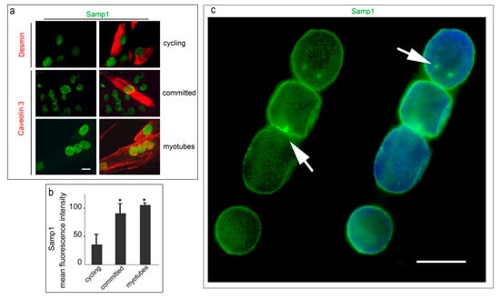 Samp1 is recruited to the nuclear periphery in differentiating human control myoblasts. (a) Samp1 (green) and desmin (red) were co-stained in cycling human myoblasts (cycling). Samp1 and caveolin 3 (red) were co-stained in committed myoblasts (committed) and myotubes (myotubes). Nuclear envelope localization of Samp1 is observed in all caveolin 3-positive cells. (b) Quantitative analysis of mean fluorescence intensity is reported in the graphs. (c) A myotube labeled with Samp1 antibody and counterstained with DAPI shows a few sites of accumulation of Samp1 in areas possibly corresponding to centrosome remnants (arrows). Statistically significant differences by the Mann Whitney test are indicated by asterisks (*). Scale bars, 10 µm.