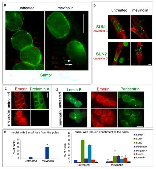 Samp1 has been recently shown to interact with gamma-tubulin, which is a major part of centrosomes [22]. In this case, we wanted to check the fate of pericentrin, which is a major binding partner of gamma-tubulin that is associated with the centrosome in proliferating myoblasts and moves to the nuclear periphery in myotubes [17,33]. Figure 2d shows localization of pericentrin at the nuclear periphery and accumulation at the nuclear poles of myonuclei [17]. Pericentrin localization is preserved in mevinolin-treated cells even though, in drug-treated myotubes, a percentage of pericentrin negative nuclear poles is observed (Figure 2d). The evaluation of these results (Figure 2d) suggests that prelamin A affects Samp1 as well as LINC protein localization in a significant percentage of myotube nuclei.