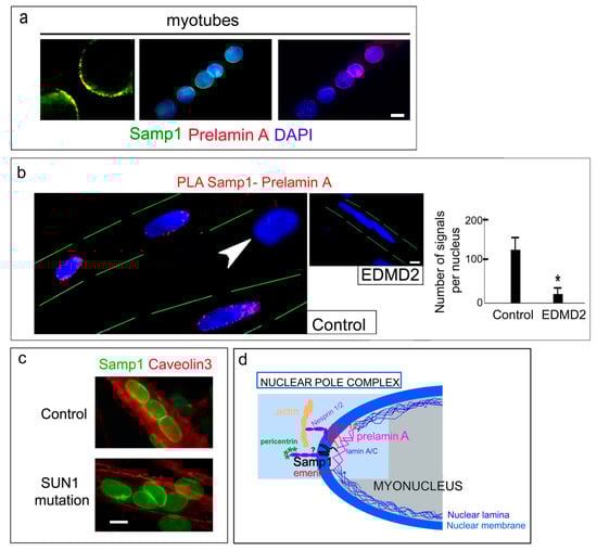 In this study, we hypothesized that Samp1 could be part of the protein platform formed by LINC proteins and prelamin A at the myotube nuclear envelope and, as previously demonstrated for those proteins, could be affected in EDMD2. Our results show that Samp1 is recruited to the nuclear envelope of human myotubes and myoblasts committed to differentiation and persists in mature human muscle, which supports previous data obtained in murine cells [27]. Although we observe a uniform distribution of Samp1 in the nuclear envelope, loss of prelamin A farnesylation [15] causes Samp1 mislocalization from the nuclear poles. Moreover, in EDMD2 myotubes, Samp1 is overall preserved at the nuclear envelope, which is reported in Reference [30], but it is missing from the nuclear poles. Thus, a protein platform including farnesylated prelamin A, SUN proteins, and Samp1 is located at the nuclear poles of myonuclei and it is disrupted in EDMD2. Samp1 loss from the nuclear poles might contribute to an altered interplay of the nucleus with cytoskeleton or centrosomal constituents in EDMD2.