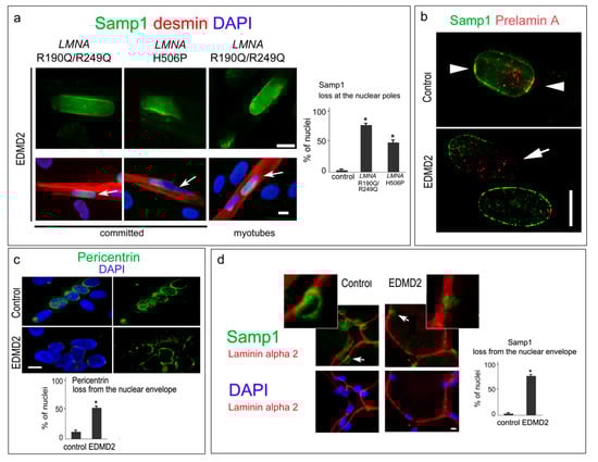 We also observed significant reduction of pericentrin fluorescence intensity at the nuclear periphery of EDMD2 myotubes (Figure 4c), which suggests that LMNA mutations impair pericentrin recruitment during myotube formation as previously observed in SUN1 and nesprin 1 mutant cells [13,17]. This finding is relevant in view of the reported interplay of Samp1 with centrosomal constituents. In EDMD2 mature muscle, we observed mis-localization of Samp1 from the nuclear envelope of myonuclei. In fact, double immunolabeling of Samp1 and laminin alpha 2, which lines the basal lamina of myofibers, demonstrated that nuclei inside control muscle fibers were Samp1 positive and the protein was located at the nuclear periphery, which was previously reported in Reference [30], while interstitial nuclei presented a faint staining (Figure 4d). In EDMD2 myonuclei bearing the H506P LMNA mutation [32], Samp1 was mis-localized in the vast majority (80%) of examined myofibers (Figure 4d) possibly due to a loss of interaction with farnesylated prelamin A, which is dramatically reduced in EDMD2 muscle fibers [15].