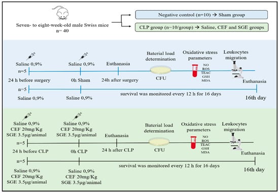 Therefore, we showed for the first time that SGE of Ae. aegypti protects mice against oxidative stress in a CLP model, which is considered the gold standard sepsis model [31] and most closely represents the clinical scenario with progression of sepsis [32]. In this model, the severity of sepsis can be adjusted by increasing the needle puncture size, number of punctures, or length of cecal ligation [31,33,34]. Thus, we performed a moderate CLP (50%, two punctures with a 22G needle) so that the animals died in the 6 days after CLP [21,35]. In our studies, animals of the saline group died within 6 days, those in the CEF group died within 7 days, while those pretreated with SGE survived until the end of 16th day, recovered their body weight, and were shown be healthy.
