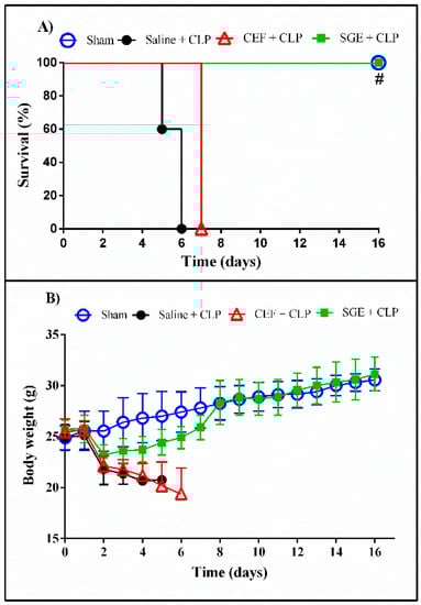 Effect of SGE on survival rate (%) and body weight (g) of septic mice within 16 days. (A) Survival of CLP animals pretreated with SGE (3.5 µg/animal), CEF (20 mg/kg), or saline. (B) Body weight during time evaluated for survival. Data presented as mean ± SD (n = 5). Kaplan–Meier analysis (# p < 0.005 CLP versus CLP + saline). CEF: ceftriaxone; CLP: cecal ligation and puncture SGE: salivary gland extract.
