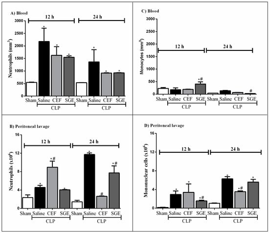 With respect to mononuclear cells, the saline-pretreated septic animals showed a significant increase in the number of these cells in the peritoneal fluid after 12 h, with a peak of influx at 24 h compared to sham groups (Figure 3D). The pre-treatment with SGE reduced the mononuclear cell influx at 12 h but not at 24 h after CLP induction (panel D), while the pretreatment with CEF inhibited these cells only within 24 h, as compared to saline-pretreated CLP group (Figure 3D). In summary, SGE significantly altered the influx of neutrophils into the peritoneal cavity.