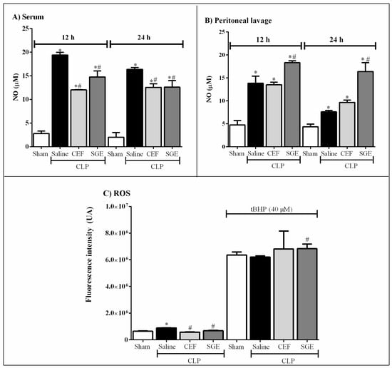 To access the oxidative status in septic animals, the production of NO and intracellular ROS was analyzed. Saline-pretreated CLP animals presented increased levels of NO in the serum (Figure 4 panel A) and on peritoneal lavage (panel B) at 12 h, remaining at high levels at 24 h compared to sham animals (Figure 4). The pretreatment with CEF or SGE lightly reduced the NO production after 12 and 24 h in blood from animals with sepsis, as compared to saline-pretreated animals (Figure 4A). The pretreatment with SGE increased the NO levels induced by infection in the peritoneal cavity, while pretreatment with CEF did not change the production of this mediator at all evaluated times compared to saline-pretreated animals (Figure 4B). Figure 4C shows that in vitro the peritoneal cells collected from septic animals, regardless of the group (saline, CEF, or SGE-treated), produced significant levels of ROS compared to the sham group. However, this production was lower in the SGE or CEF-treated group in relation to the sham group. In the presence of t-BHP, cells from the SGE-pretreated CLP animals produced higher amounts of ROS compared to saline-pretreated septic or sham animals (Figure 4C). These data suggest that the cells of SGE-pretreated animals can produce high amounts of ROS and reactive nitrogen species (RNS) when stimulated in vitro. However, with an inflammatory/infectious focus, these cells may produce moderate amounts of ROS and RNS, avoiding severe oxidative damage in the tissue but allowing the elimination of the infectious agent.
