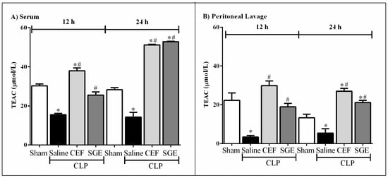 Trolox equivalent antioxidant capacity (TEAC) assay was conducted to evaluate the antioxidant parameters in septic animals. Figure 5 shows that saline-pretreated septic animals had a marked reduction in the antioxidant capacity in the serum and peritoneal cavity at the times evaluated as compared to sham animals (Figure 5A,B, respectively). On the other hand, pretreatment with SGE or CEF was able to increase the serum TEAC levels, especially at 24 h, as compared to saline-pretreated CLP groups (Figure 5A). In the peritoneal cavity, the pre-treatment with SGE or CEF also elevated the total antioxidant levels compared to sham or saline-pretreated CLP animals (Figure 5B).