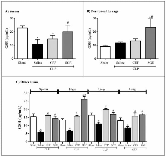 As TEAC was increased in SGE pretreated septic animals, GSH levels were also analyzed, since it is an important endogenous antioxidant able to neutralize ROS. Figure 6 shows that the induction of sepsis led to a significant decrease in GSH levels in the serum, spleen, heart, liver, and lung of animals (Figure 6A,C, respectively), without any significant alteration in peritoneal lavage compared to sham animals (Figure 6B). However, the pretreatment with SGE was able to restore the GSH levels in the blood and in most tissues evaluated, and caused a greater increase in heart and peritoneal lavage compared to the sham or saline-pretreated CLP animals (Figure 6A–C).