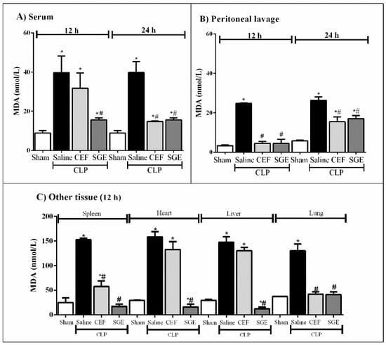 MDA levels were used as a marker of lipid peroxidation caused by oxidative imbalance. Figure 7 shows that saline-pretreated septic animals presented elevated MDA levels in serum, peritoneal lavage, and in all tissues analyzed at 12 and 24 h as compared to the sham group. The pretreatment with CEF reduced the lipid peroxidation in peritoneal lavage, spleen and lung at 12 h after CLP. On the other hand, SGE-pretreated CLP animals showed a reduction in MDA detection in the blood, peritoneal lavage, and all tissues evaluated as compared to the saline-pretreated group (Figure 7A–C). Thus, these data suggest that SGE controls the intense oxidative process in the inflammatory focus, while decreasing the bacterial load during the polymicrobial sepsis.