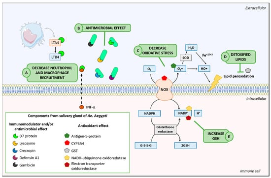 Regarding the oxidative process, some Ae. aegypti salivary components are able to modulate these parameters during blood digestion. Thereby, antioxidants such as glutathione peroxidase (GPx), GST, catalase, and GSH can neutralize pro-oxidant molecules toxic to the mosquito [64,65]. In addition, other studies [17,45] also showed that Ae. aegypti salivary antigen-5/CAP is a superoxide dismutase that bind Cu2+ and scavenges O2−, blocking the oxidative neutrophil burst induced by phorbol 12-myristate13-acetate (PMA).