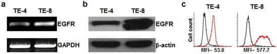 Analysis of epidermal growth factor receptor (EGFR) expression on esophageal squamous cell carcinoma (ESCC) TE-4 and TE-8 cell lines. (a) RT-PCR analysis. Internal control used human GAPDH. (b) Western blot. Internal control used human beta actin. (c) Flow cytometry analysis. Black line represents treatment with isotype control and red line represents treatment with cetuximab antibody.