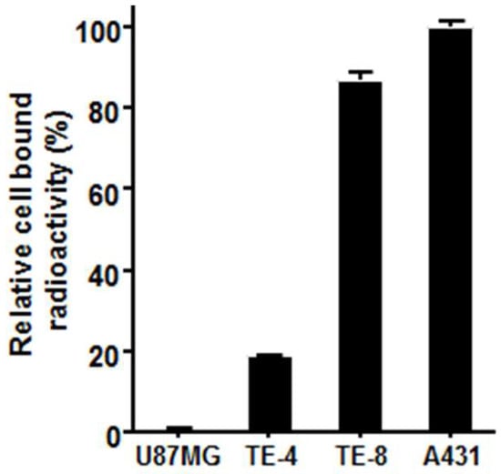Cell binding studies using 64Cu-cetuximab were performed using A431, U87MG, TE-4, and TE-8 cells []. Nonspecific binding was determined in the presence of 100-fold excess of cetuximab. After incubation, the samples were washed twice in cold PSA containing 1% BSA. Each sample was counted in a gamma counter (Wizard 1480; Perkin-Elmer, Waltham, MA, USA). Each cell-bound radioactivity (%) was calculated using (cell-bound radioactivity-nonspecific binding radioactivity)/total radioactivity ×100, and data were expressed as relative cell-bound radioactivity using A431 cell-bound radioactivity as a control.