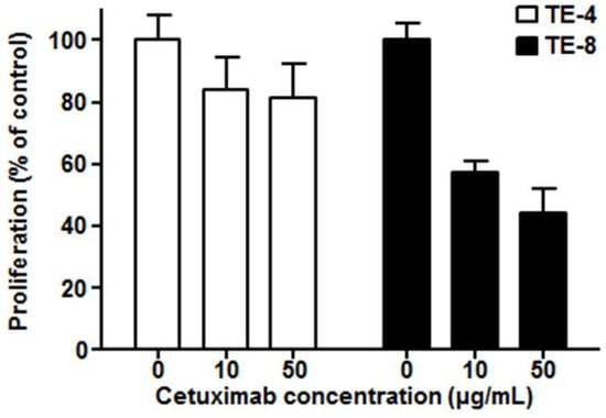 We examined the antiproliferative effect of cetuximab against high-EGFR-expressing cell line TE-8 and low-EGFR-expressing cell line TE-4. Cetuximab-induced cell growth inhibition was found in high-EGFR-expressing TE-8 cells, while it was minimal in low-EGFR-expressing TE-4 (Figure 3). TE-8 cells showed 57.2 ± 3.9% (10 μg/mL) and 44.4 ± 7.5% (50 μg/mL) viability compared to control; however, TE-4 cells still kept more than 80% viability even with 50 μg/mL of cetuximab.