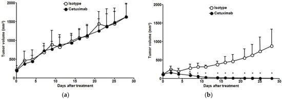 Antitumor effects of cetuximab were assessed in TE-4 and TE-8 xenograft models (Figure 4). In the isotype group, the growth rate of TE-4 tumors was faster than that of TE-8 tumors. There was no difference in tumor growth between isotype and cetuximab treatment in TE-4 model (Figure 4a). TE-8 tumor growth was inhibited after second administration of cetuximab, and the TE-8 tumor markedly regressed with cetuximab treatment (92.5 ± 5.9% tumor reduction, p < 0.001); however, the TE-8 tumor volume continuously increased with isotype treatment (Figure 4b). TE-8 tumor volume in the cetuximab treatment group showed a statistically significant difference after four days (p < 0.01). Cetuximab treatment was well tolerated in both TE-4 and TE-8 xenograft models, and no apparent body weight loss was observed (Figure S1).