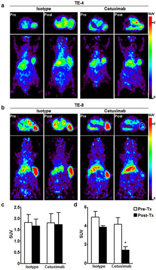 There were some limitations to the current study. First, because two ESCC cell line model was used, expanded preclinical and clinical research are required in various ESCC animal models and clinical patients with tumors expressing varying level of EGFR to validate the association between 64Cu-PCTA-cetuximab accumulation in tumor lesion and prognosis after cetuximab immunotherapy and to establish PET signal cutoff value for target selection as imaging biomarker. Second, analysis of genetic mutation of EGFR in ESCC was absent. Although driver gene mutations have not been detected in ESCC, the somatic mutation rate in ESCC is relatively high compared to other solid tumors, and it may attenuate the therapeutic effect to EGFR-targeted therapy []. Third, the possibility of the low uptake of 64Cu-PCTA-cetuximab in TE-8 model by cetuximab immunotherapy exists. However, there was no reduced uptake of 64Cu-PCTA-cetuximab in TE-4 tumor with intermediate EGFR expression by cetuximab treatment (Figure 5a,c). Luo et al. [] reported systemic pharmacokinetic data of cetuximab in preclinical EGFR-expressing tumor model and nude mice without tumor. The plasma half-life of cetuximab at 1 mg dose of intravenous injection was 39.6 h, Tmax was 3 h, and Cmax was 407.6 g/mL in nude mice without tumor. However, the plasma concentration of cetuximab at 1 mg dose of intraperitoneal injection was 153.6 g/mL at 6 h and 17.7 g/mL at 24 h in tumor-bearing mice. In case of tumor-bearing mice, plasma clearance was faster than nude mice without tumor. Our experiment was also performed in EGFR-expressing tumor. Therefore, the plasma clearance of i.v.-injected cetuximab for treatment would have shown similar patterns as the previous study. Furthermore, TE-4 tumor has moderate EGFR expression, which is easily blocked by treatment dose of cetuximab. However, in our experimental design, TE-4 tumor uptake of 64Cu-PCTA-cetuximab was maintained in cetuximab-treated TE-4 tumor at a similar level as that before cetuximab treatment.