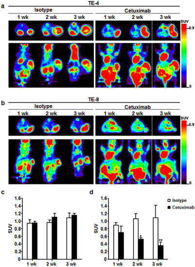 18F-FDG-PET images were obtained once a week for three weeks during treatment. For TE-4 tumors, 18F-FDG SUVs in isotype-treated group were 0.9 ± 0.1, 1.0 ± 0.1, and 1.1 ± 0.1 (Figure 6a,c), and those in cetuximab-treated group were 1.0 ± 0.0, 1.1 ± 0.1, and 1.2 ± 0.1 (Figure 6b,d) at 1, 2, and 3 weeks, respectively. Throughout the three-week treatment course, no statistically significant difference in 18F-FDG uptake was detected between isotype-treated group and cetuximab-treated group in TE-4 tumors. For TE-8 tumors, the SUVs of 18F-FDG in isotype-treated group were 0.9 ± 0.1, 1.1 ± 0.1, and 1.1 ± 0.3, and those in cetuximab-treated group were 0.7 ± 0.2, 0.5 ± 0.0, and 0.4 ± 0.1 at 1, 2, and 3 weeks, respectively. 18F-FDG uptake reduction rates in cetuximab-treated group were 21.7%, 49.8%, and 62.4% at 1, 2, and 3 weeks, respectively, compared to 18F-FDG uptake in isotype-treated group at each time point. The differences were statistically significant (p < 0.01) except for 1 week.