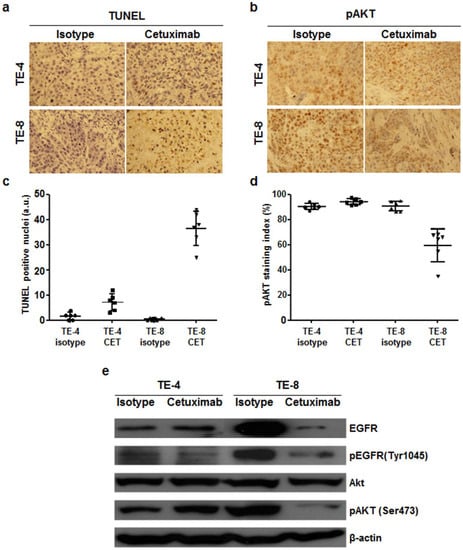 Immunohistochemial staining of TUNEL and phospho-Akt and western blot analysis of TE-4 and TE-8 tumors with isotype or cetuximab treatment. Apoptotic nuclei and phospho-Akt immunoreactivity are shown in brown. (a) TUNEL positive nuclei significantly increased in TE-8 tumor with cetuximab treatment. (b) pAkt immunoreactivity markedly decreased in cetuximab-treated TE-8 tumor. Representative images were taken under ×400 magnification. (c) and (d) TUNEL positive nuclei (c) and pAkt staining index (d) were quantified. (e) Western blot analysis of EGFR expression level and its downstream targets in TE-4 and TE-8 tumor. EGFR and pAkt level in TE-8 tumor markedly decreased with cetuximab treatment, but they were maintained in TE-4 tumor.