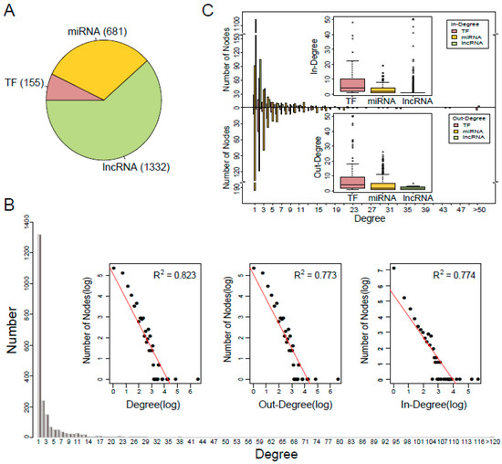 Characteristics of the TFs and ncRNAs coordinated regulatory (TNCR) network. (A) Proportion of transcription factor (TF), microRNA (miRNA) and long non-coding RNA (lncRNA) in the TNCR network. (B) Degree distribution of all nodes in the TNCR network and the log-log plots for the degree, out-degree and in-degree distributions of all nodes. (C) In-degree and out-degree distributions of TFs, miRNAs and lncRNAs in the TNCR network.