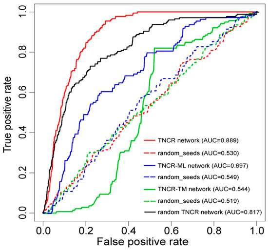 Receiver operating characteristic (ROC) curves and area under the curve (AUC) values for the random walk with restart (RWR) method on the whole, partial and random TNCR networks with real seeds and random seeds. The ROC curves were plotted and AUC values were calculated separately by leave-one-out cross-validation (LOOCV) for the TNCR network, TNCR-ML (miRNAs and lncRNAs only) network, TNCR-TM (TFs and miRNAs only) network and the random TNCR network with real and random seeds.