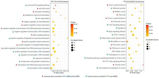 The top 20 Gene Ontology (GO) enrichment and Kyoto Encyclopedia of Genes and Genomes (KEGG) enrichment results for top ranked TFs. The common enriched GO terms and KEGG pathways among top ranked TFs, miRNAs and lncRNAs are marked.