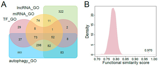 Evaluation of the top ranked regulators associated with autophagy. (A) Venn plot for the GO functional annotation comparison among the top ranked TFs, miRNAs, lncRNAs and the known autophagy-associated factors. (B) Distribution of random functional similarity scores for the top ranked TFs and the autophagy-associated factors. The triangle indicates the true functional similarity score for top ranked TFs and the known autophagy-associated factors.