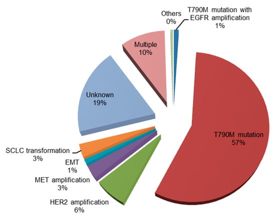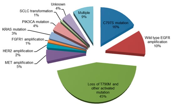 The epidermal growth factor receptor (EGFR) is a receptor protein penetrating the cell membrane. The kinase domain is composed of the N and C lobes and an adenosine triphosphate (ATP) binding cleft between the two lobes. Following the binding of a ligand to the receptor, an asymmetric dimer is formed and the phosphate of ATP is transferred to the tyrosine residue of the regulatory domain. Various proteins are bound to this phosphorylated tyrosine and signals are transmitted downstream through the rat sarcoma (RAS)-rapidly accelerated fibrosarcoma (RAF)-mitogen-activated protein kinase (MAPK) and phosphatidylinositol 3-kinase (PI3K)-protein kinase B (PKB, also known as AKT) pathways. EGFR tyrosine kinase inhibitors (TKIs) competitively inhibit ATP with cleft of the kinase domain. Gefitinib, a first-generation EGFR-TKI, greatly improved the prognosis of EGFR gene mutation-positive patients with non-small-cell lung cancer (NSCLC) [,]. The vast majority (93%) of EGFR activation mutations (common mutations) occur in exons 19 to 21. In addition, deletion mutations in exon 19 and L858R mutations in exon 21 are particularly frequent (44.8% and 39.8%, respectively) []. Although EGFR-TKIs show an excellent therapeutic effect on EGFR-mutated NSCLC, most cancers develop resistance to EGFR-TKI. The T790M mutation in exon 20 is recognized in approximately half of EGFR-TKI tolerance cases [,]. In this review, we will summarize the mechanism of EGFR-TKI tolerance and present treatment strategies to overcome resistance. There are several outstanding reviews so far [,,,], but therapeutic drugs progress one after another and a new resistance mechanism emerges. Therefore, we would like to review focusing on the novel acquired resistance of the third-generation EGFR-TKI, osimertinib based on the latest academic information.