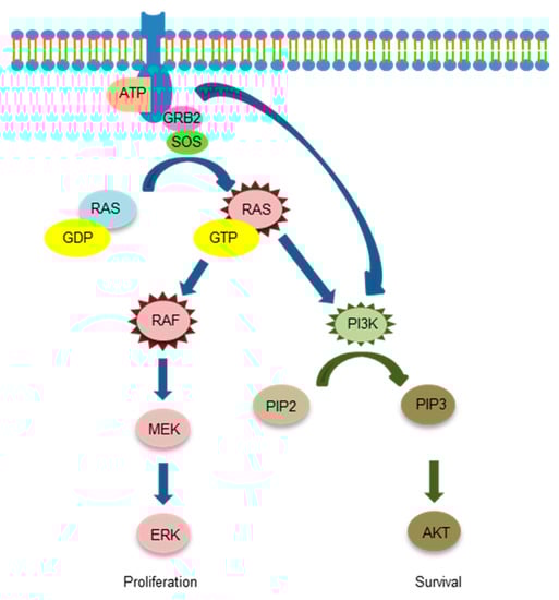 MAPK/PI3K alterations include v-raf murine sarcoma viral oncogene homolog B1 (BRAF)V600E mutation [], phosphoinositide-3-kinase P110α catalytic subunit (PIK3CA)E545K mutation [], and Kirsten rat sarcoma viral oncogene homolog (KRAS)G12D mutation []. These MAPK/PI3K alterations will be described in detail in Section 2.4.1, Section 2.4.2 and Section 2.4.3.