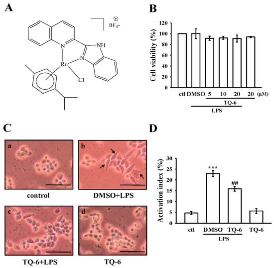 Effects of [Ru(η6-cymene)2-(1H-benzoimidazol-2-yl)-quinoline Cl]BF4 (TQ-6) on cell viability and morphological changes in lipopolysaccharide (LPS)-stimulated RAW 264.7 cells. (A) Chemical structure of TQ-6. (B) Cells were treated with 0.1% DMSO or pre-treated with TQ-6 (5–20 μM) for 20 min and then treated with LPS (1 μg/mL) for 24 h. Cell viability was evaluated as described in the Methods section. (C) Cell morphology was observed using optical microscopy. Black bar = 50 μm. Activated cells are indicated by arrows. (D) The activation index percentage was shown as the number of cells with activated morphology relative to the total number of cells. Data are presented as the means ± SEM (n = 4). *** p < 0.001, compared with the control group; ## p < 0.01, compared with the LPS group.