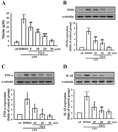 Effects of TQ-6 on nitric oxide (NO) production, nitric oxide synthase (iNOS) expression, tumor necrosis factor alpha (TNF-α), and interleukin-1 beta (IL-1β) production in LPS-stimulated RAW cells. (A) Cells were pretreated with TQ-6 (5, 10, and 20 μM) for 20 min and then stimulated by LPS (1 μg/mL) for 24 h. NO was measured using Griess reagent; (B–D) Cells were pretreated with TQ-6 (10 and 20 μM) for 20 min and then stimulated by LPS (1 μg/mL) for 24 h. The levels of (B) iNOS, (C) TNF-α, and (D) IL-1β protein expression were evaluated as described in the Methods section. Data are presented as the means ± SEM (n = 4); * p < 0.05 and *** p < 0.001, compared with the control group; # p <0.05, ## p < 0.01, and ### p < 0.001, compared with the LPS group.