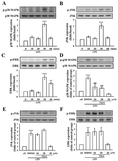 The influence of TQ-6 on LPS-induced phosphorylation of p38 mitogen-activated protein kinase (MAPK), c-Jun NH2-terminal kinase (JNK), and extracellular signal-regulated kinase (ERK) in RAW cells. (A–C) Cells were treated with LPS (1 μg/mL) for the indicated times (10–60 min) and the phosphorylation of (A) p38 MAPK, (B) JNK, and (C) ERK were determined by immunoblotting as described in the Methods. (D–F) Cells were treated with 0.1% DMSO or TQ-6 (10 and 20 μM) for 20 min, followed by LPS (1 μg/mL) for 30 min, and the phosphorylation of (D) p38 MAPK, (E) JNK, and (F) ERK were evaluated by immunoblotting. Data are presented as the means ± SEM (n = 4). ** p < 0.01 and *** p < 0.001, compared with the control group; ## p < 0.01, compared with the LPS group.