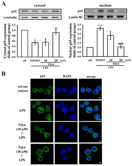 Following inflammatory stimulation, NF-κB is activated by post-translational modifications, and translocates into the nucleus to induce the transcription of pro-inflammatory genes []. To determine the effect of TQ-6 on the nuclear translocation of the NF-κB p65 subunit, the RAW cells were treated with TQ-6 and then stimulated with LPS. As shown in Figure 5A, the level of total p65 proteins was markedly decreased in cytosolic fractions, which was associated with the increase in the nuclear fraction of the LPS-stimulated cells, whereas TQ-6 (20 μM) treatment significantly reversed the p65 accumulation in both cytosolic and nuclear fractions.