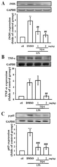Effects of TQ-6 on the expression of iNOS, TNF-α, and p65 proteins in liver tissues of LPS-induced mice. Mice were given an intraperitoneal injection of TQ-6 (1 and 2 mg/kg) 2 h prior to administration of LPS (2.5 mg/kg). After a 6 h LPS stimulation, the protein expression of (A) iNOS, (B) TNF-α, and (C) p65 were analyzed. Data presented are the means ± SEM (n = 6); ** p < 0.01 and *** p < 0.001, compared with the control group; ## p < 0.01 and ### p < 0.001, compared with the LPS group.