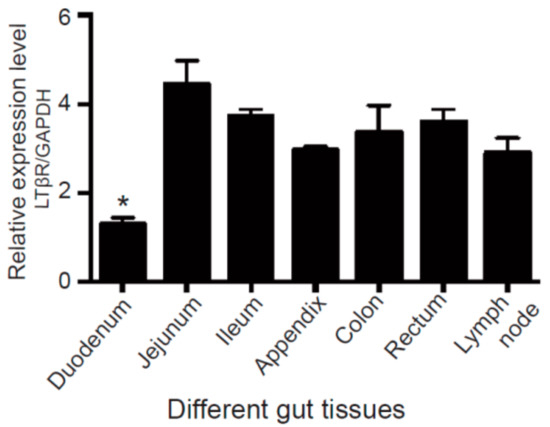 Expression of the lymphotoxin beta receptor (LTβR) in different porcine gut tissues. Tissues, including the duodenum, jejunum, ileum, appendix, colon, rectum and lymph nodes, were collected from adult male Large White pigs (n = 4), and real-time PCR was used to measure the expression level of LTβR. * p < 0.05 was considered statistically significant. Note that the duodenum showed significantly lower expression of LTβR than other gut tissues.