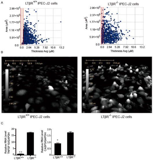 The effect of LTβR on IPEC-J2 apoptosis. LTβR+/+ and LTβR−/− cells were seeded into 6-well plates, and apoptosis was monitored for 72 h by HoloMonitor®M4 microscopy. (A) Dot plot of LTβR+/+ and LTβR−/− IPEC-J2 cells after 72 h culture. The x-axis is the average thickness (µM) of the cells, and the y-axis presents the surface area of the cells (µM2). Apoptotic cells with lower thickness and higher surface area are between the red lines. Note there are almost no apoptotic cells between the red lines for the LTβR+/+ group (left), while significantly more apoptotic cells are found in the LTβR−/− cell population (right). (B) Three-dimensional structures of living LTβR+/+ (left) and LTβR−/− (right) cells after 72 h. The number of tall cells is noticeably increased in LTβR−/− cells. (C) Real-time PCR data of TNF superfamily member 10 (TNFSF10) and Caspase 3 (CASP3) in LTβR+/+ and LTβR−/− cells, * p < 0.05 and ** p < 0.01.
