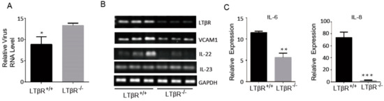 LTβR is reportedly highly expressed in the lymph nodes, duodenum and jejunum of eight-day-old newborn piglets, which may be beneficial for developing resistance to E. coli F18 in pigs [21], and IPEC-J2 cells are susceptible to PEDV infection [22]. As such, we investigated the effects of LTβR on PEDV infections in IPEC-J2 cells. We challenged LTβR+/+ and LTβR−/− cells with the PEDV CV777 strain (at a multiplicity of infection (MOI) of 1), and cells were harvested 48 h later to determine the relative viral expression level by real-time PCR using PEDV-specific primers. Our data showed that RNA levels of PEDV in LTβR−/− IPEC-J2 cells were significantly higher than those in wild-type IPEC-J2 cells (Figure 5A). Since PEDV infection destroys epithelial barrier integrity [22], and LTβR signaling was reported to limit mucosal damage through the IL-22-IL-23 pathway [10], we examined the expression levels of LTβR downstream genes by semi-quantitative PCR, including VCAM1, IL-22 and IL-23, in PEDV-infected cells. Our data revealed that VCAM1 and IL-22 expression was substantially decreased in LTβR−/− IPEC-J2 cells, while IL-23 was intact (Figure 5B). The NFκB-dependent genes IL-6 and IL-8 are reported to be induced by activation of LTβR signaling [4,23]. We detected expression levels of IL-6 and IL-8 in infected cells, and the data showed that both genes were significantly decreased in infected LTβR−/− IPEC-J2 cells (Figure 5C).