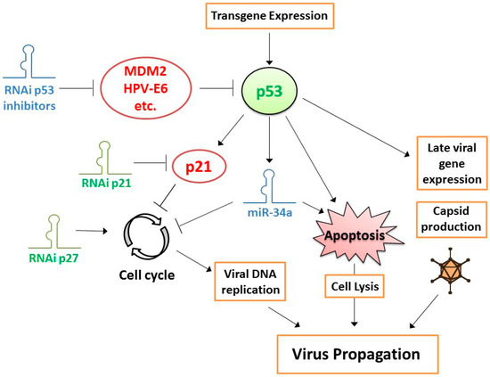 Tumor suppressor p53-dependent strategies to increase the potency of conditionally replicating adenoviruses (CRAds). Expression of functional p53 in cancer cells promotes CRAd propagation by stimulating late viral gene expression and accelerating cell lysis to release virus progeny. In contrast, direct p53 target p21 inhibits the cell cycle and, thereby, viral DNA replication. Silencing cyclin-dependent kinase inhibitors p21 or p27 through RNA interference (RNAi) alleviates cell cycle arrest and, thus, promotes viral DNA replication. Potential other means of promoting CRAd propagation include silencing of p53 inhibitors, which are known to inhibit CRAd replication, and silencing of p53 transcriptional target microRNA (miR)-34a. Molecules in red depict confirmed inhibitors of CRAd efficacy; molecules in green depict confirmed stimulators of CRAd efficacy; molecules in blue depict proposed, but not yet experimentally confirmed modulators of CRAd efficacy; orange delineated viral processes can be influenced to increase potency; cellular processes that are affected by viruses during infection and that can be modulated by transgenes and RNAi molecules expressed by armed CRAds are delineated in black.