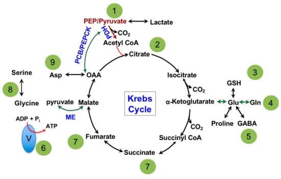 - Owen, O.E.; Kalhan, S.C.; Hanson, R.W. The Key Role of Anaplerosis and Cataplerosis for Citric Acid Cycle Function. J. Biol. Chem. 2002, 277, 30409–30412. [Google Scholar] [CrossRef] [PubMed]