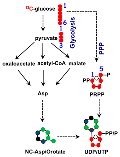 Biochemistry of pyrimidine nucleotide synthesis. Ribose base biosynthesis comes from the pentose phosphate pathway (PPP) in the cytosol. Mitochondrial TCA cycle metabolites oxaloacetate and aspartate (asp) supply three out of the four carbons in the diazine ring. •: Possible cytosolic-derived carbons, •: Possible mitochondrial-derived carbons. •: Nitrogen.