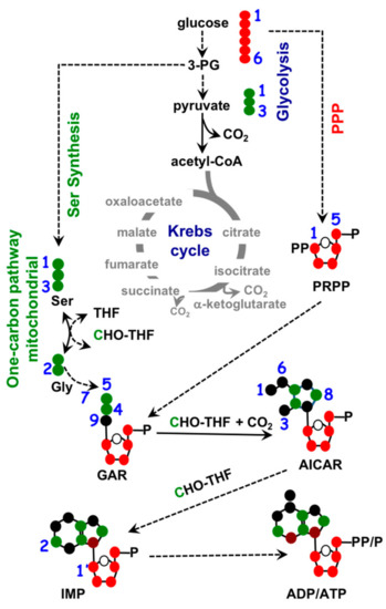Biochemistry of purine nucleotide synthesis. Ribose base biosynthesis comes from pentose phosphate pathway (PPP) in the cytosol, mitochondrial 1-carbon metabolism contributes to purine ring biosynthesis through 5-methyltetrahydrofolate (CHO-THF). •: Possible cytosolic-derived carbons, •: Possible mitochondrial-derived carbons.