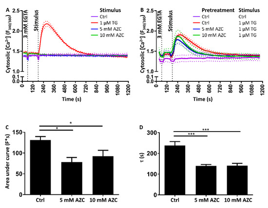 To determine the relation between AZC treatment and intracellular Ca2+ handling, we investigated whether AZC treatment directly impacts the Ca2+ stores. We therefore loaded the cells with the cytosolic Ca2+ indicator Fura-2 AM and followed its fluorescence on a FlexStation 3 microplate reader. To prevent influx of Ca2+ in the cell, the extracellular Ca2+ was first chelated by addition of 3 mM EGTA, and the SERCA inhibitor TG was subsequently used to uncover Ca2+ release from the ER. While TG led to an increase in cytosolic [Ca2+], acute application of either 5 mM or 10 mM AZC did not provoke a rise in cytosolic [Ca2+] (Figure 8A). However, when cells were pre-treated for 6 h with 5 mM or 10 mM AZC and TG-induced [Ca2+] elevations were monitored, we noticed a lower rise of cytosolic Ca2+ in the pre-treated samples as compared to the control samples (Figure 8B). This was reflected by a ~35% lower area under the curve (Figure 8C). Additionally, the clearance of Ca2+ from the cytosol appeared faster after AZC pretreatment, as indicated by a ~42% lower τ value for the decline phase of the Fura-2 AM signal (Figure 8D).